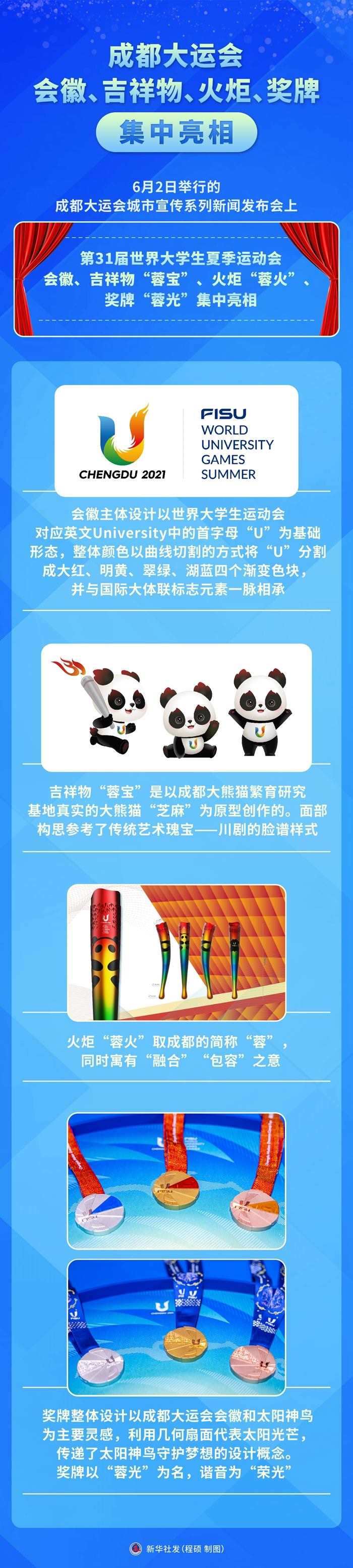 新華社成都6月2日電(記者董小紅、陳地)2日舉行的成都大運(yùn)會城市宣傳系列新聞發(fā)布會上,第31屆世界大學(xué)生夏季運(yùn)動會會徽、吉祥物“蓉寶”、火炬“蓉火”、獎牌“蓉光”集中亮相。