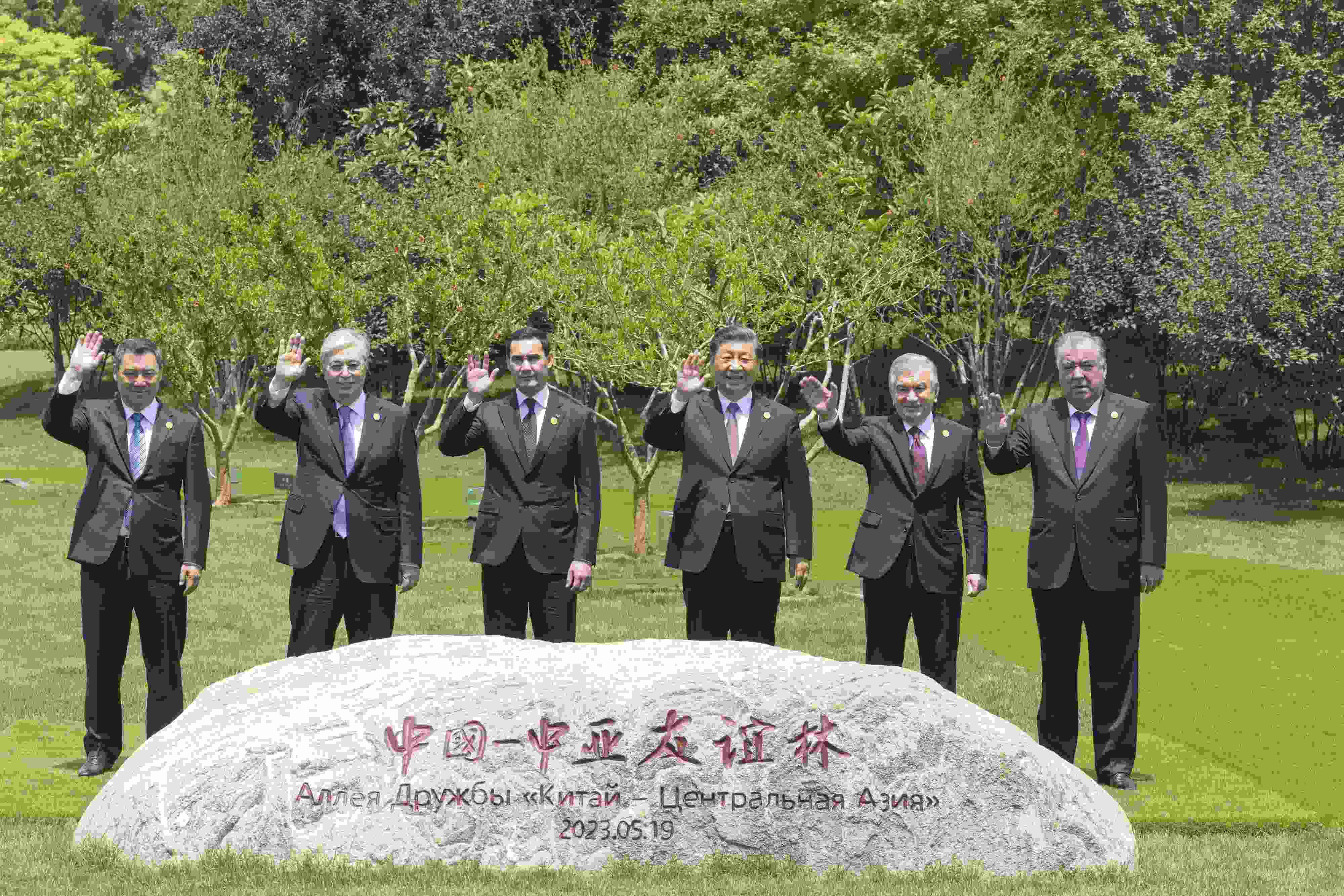 △5月19日上午,習(xí)近平主席在陜西省西安市主持首屆中國-中亞峰會(huì)并發(fā)表主旨講話。峰會(huì)結(jié)束后,習(xí)近平和中亞五國元首共同種下六棵石榴樹。