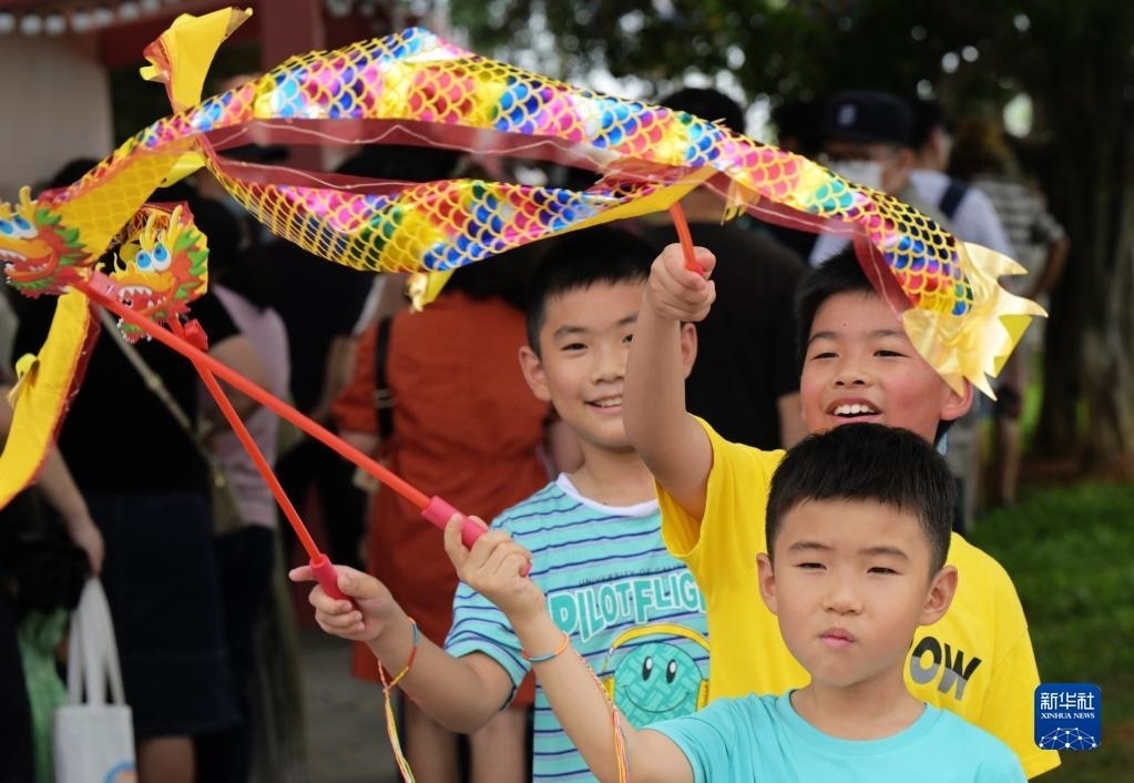 6月3日,廈門小學(xué)生在2023海峽兩岸(集美)龍舟文化節(jié)活動現(xiàn)場體驗(yàn)舞龍。