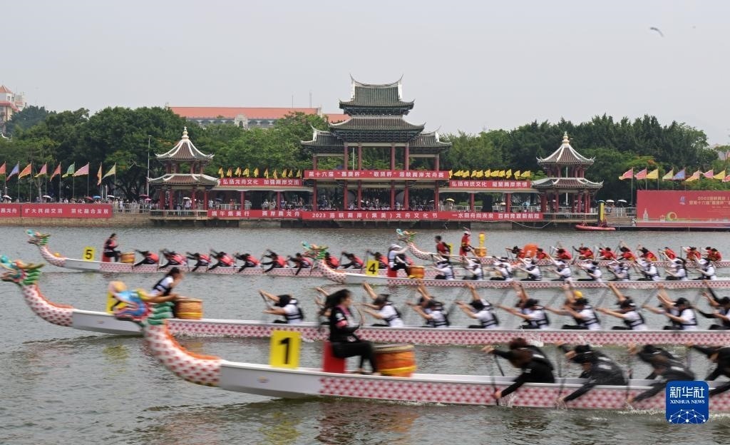 6月3日,在福建廈門集美龍舟池,來自海峽兩岸的龍舟隊(duì)競渡爭先。