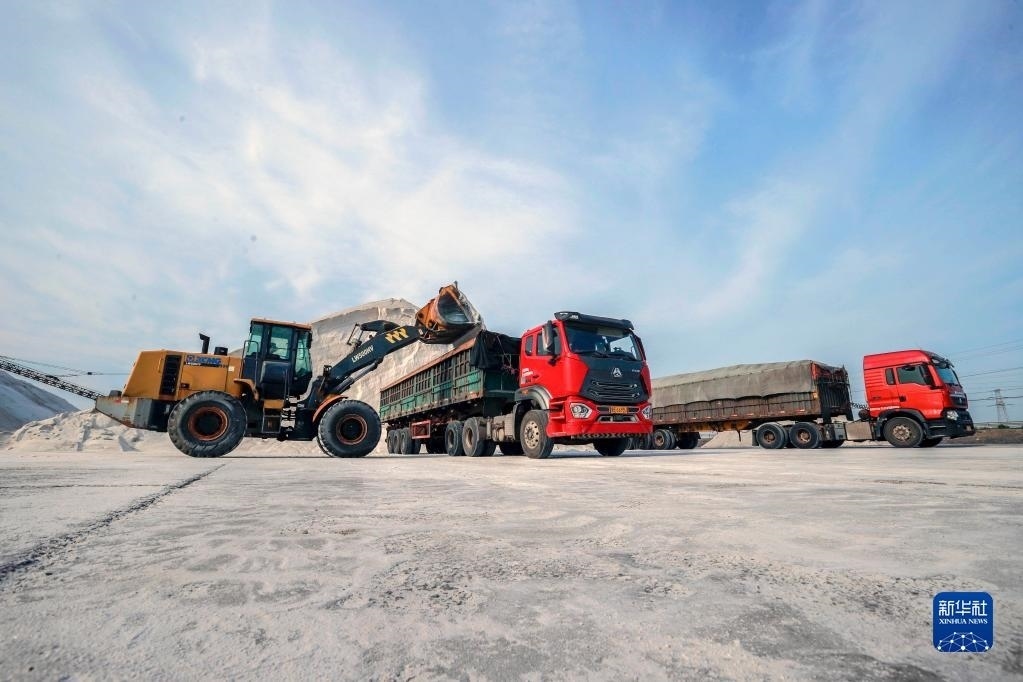 6月4日,工人操作設(shè)備在唐山海港經(jīng)濟(jì)開發(fā)區(qū)長(zhǎng)蘆大清河鹽場(chǎng)將海鹽裝車,準(zhǔn)備外運(yùn)。