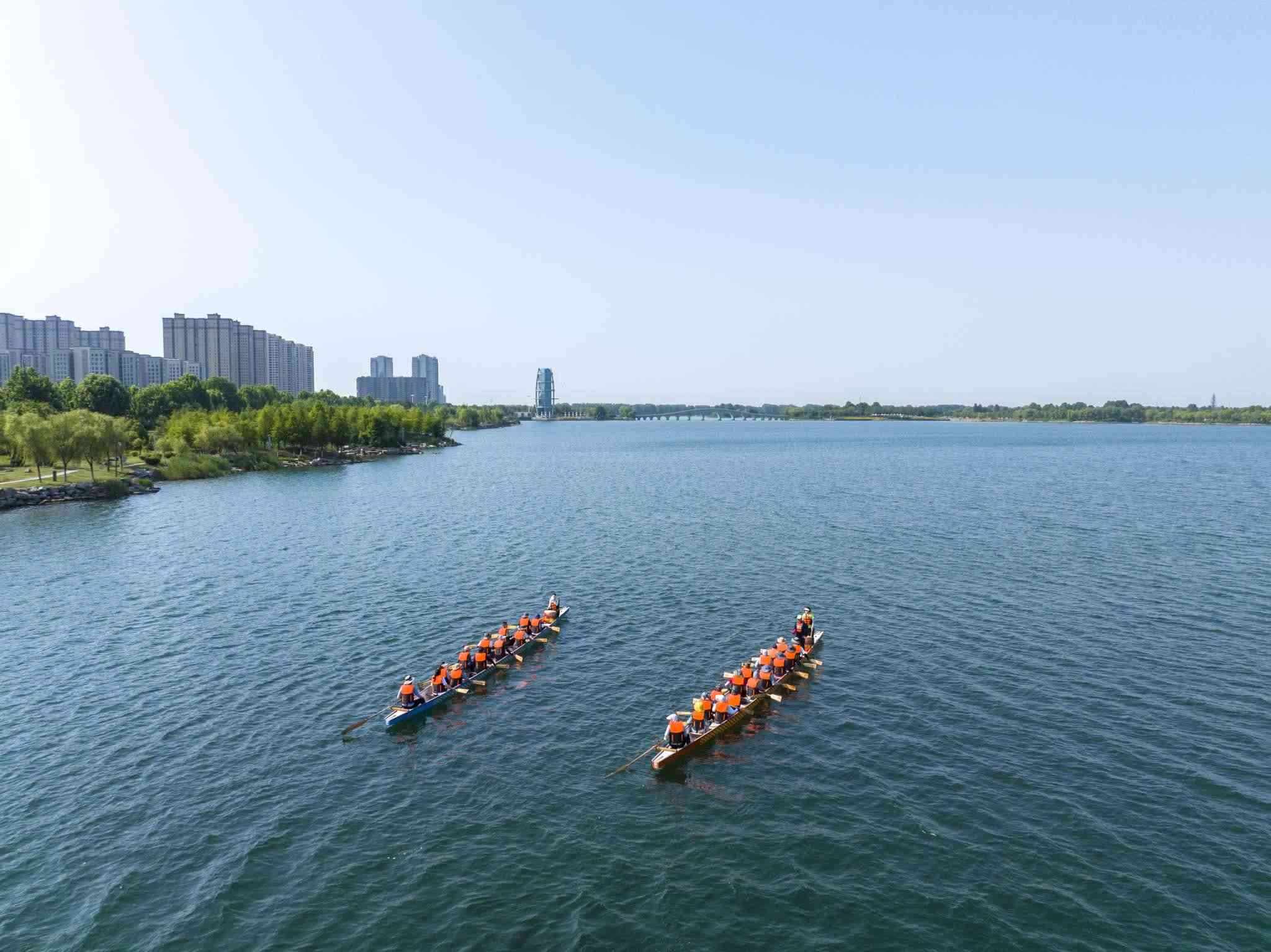2023年6月8日,江蘇連云港,東??h西雙湖風景區(qū),多支龍舟隊在西雙湖水域進行訓練,積極備戰(zhàn)端午龍舟賽。視覺中國