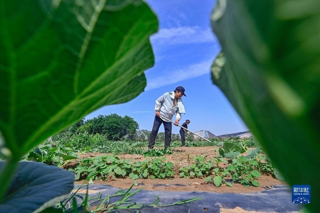 6月5日,農(nóng)民在山東省青州市高柳鎮(zhèn)南馬蘭村一處葫蘆種植基地勞作。