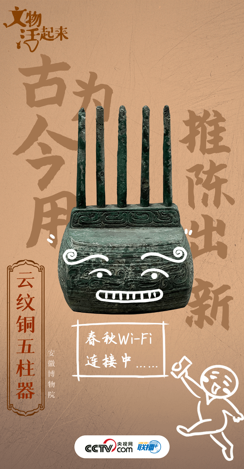 這件文物名為“云紋銅五柱器”,斷代為西周(公元前1046年-公元前771年),用途待考。早年有人認(rèn)為它是樂器,該觀點(diǎn)很快被否定。后有人認(rèn)為是某種器物的底座,亦是語焉不詳。還有人認(rèn)為是古人祭祀祖先時(shí)插先祖牌位的底座,這種觀點(diǎn)也有待于學(xué)術(shù)界論證。