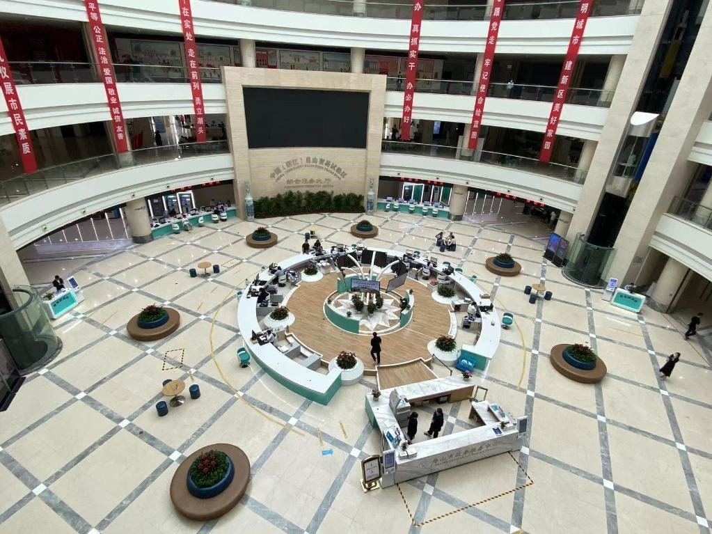 圖為浙江舟山的中國(浙江)自貿(mào)試驗(yàn)區(qū)綜合服務(wù)大廳。新華社記者魏一駿 攝
