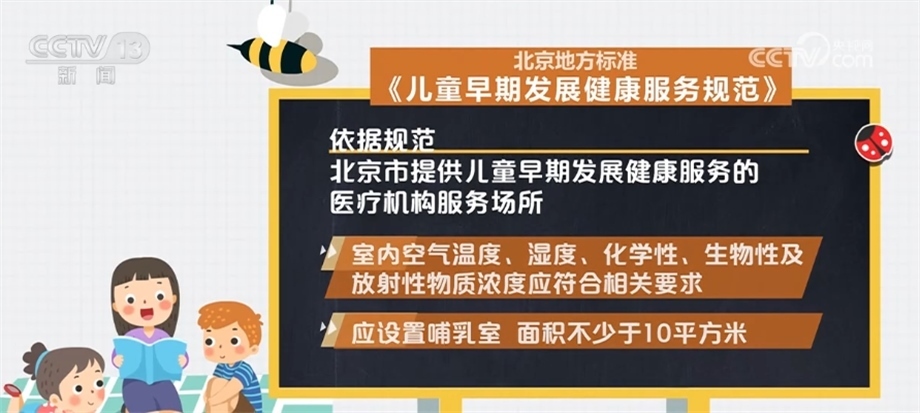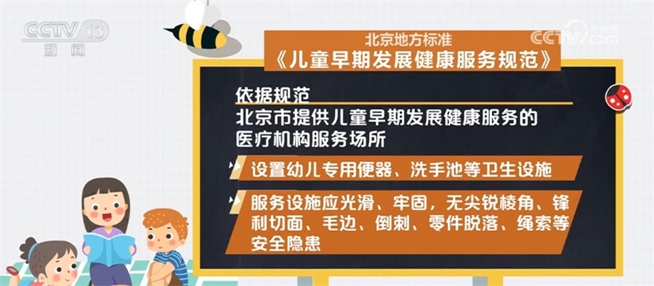 依據(jù)規(guī)范,北京市提供兒童早期發(fā)展健康服務的醫(yī)療機構(gòu)服務場所應遠離各種污染源,采光充足,通風良好,遠離噪聲與電磁干擾;設置防蚊、蟲、蠅、鼠等設備,并放置于兒童無法接觸到的地方;室內(nèi)空氣溫度、濕度、化學性、生物性及放射性物質(zhì)濃度應符合相關(guān)要求。應設置哺乳室,面積不少于10平方米;設置幼兒專用便器、洗手池等衛(wèi)生設施;服務設施應光滑、牢固,無尖銳棱角、鋒利切面、毛邊、倒刺、零件脫落、繩索等安全隱患。