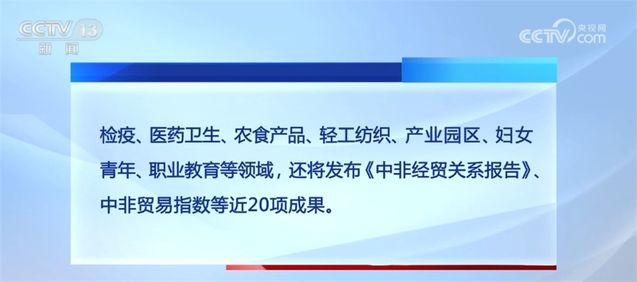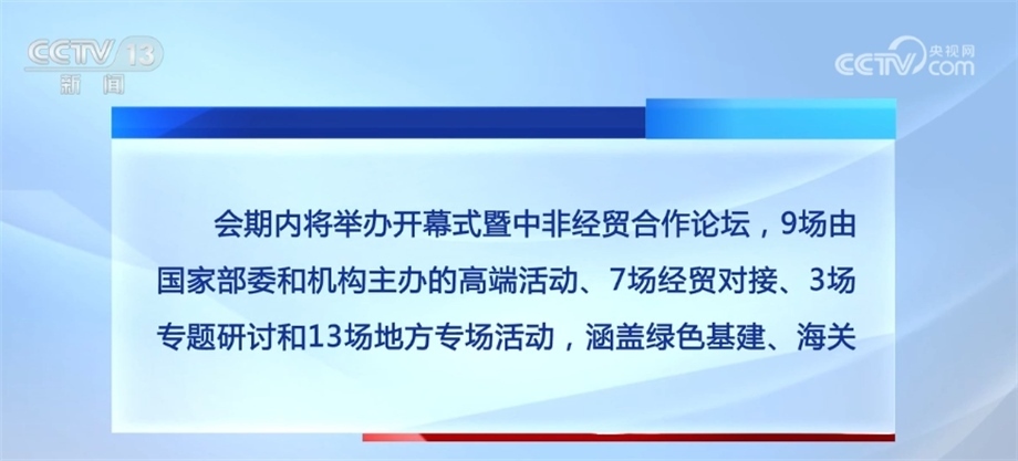 會期內(nèi)將舉辦開幕式暨中非經(jīng)貿(mào)合作論壇,9場由國家部委和機構(gòu)主辦的高端活動、7場經(jīng)貿(mào)對接、3場專題研討和13場地方專場活動,涵蓋綠色基建、海關(guān)檢疫、醫(yī)藥衛(wèi)生、農(nóng)食產(chǎn)品、輕工紡織、產(chǎn)業(yè)園區(qū)、婦女青年、職業(yè)教育等領(lǐng)域,還將發(fā)布《中非經(jīng)貿(mào)關(guān)系報告》、中非貿(mào)易指數(shù)等近20項成果。