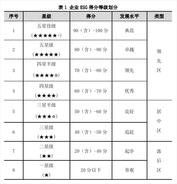 為直觀反映企業(yè)ESG水平,將ESG指數(shù)劃分為八個等級,分別為:五星佳級、五星級、四星半級、四星級、三星半級、三星級、二星級和一星級,各類企業(yè)對應(yīng)的星級水平和ESG發(fā)展水平見表1。