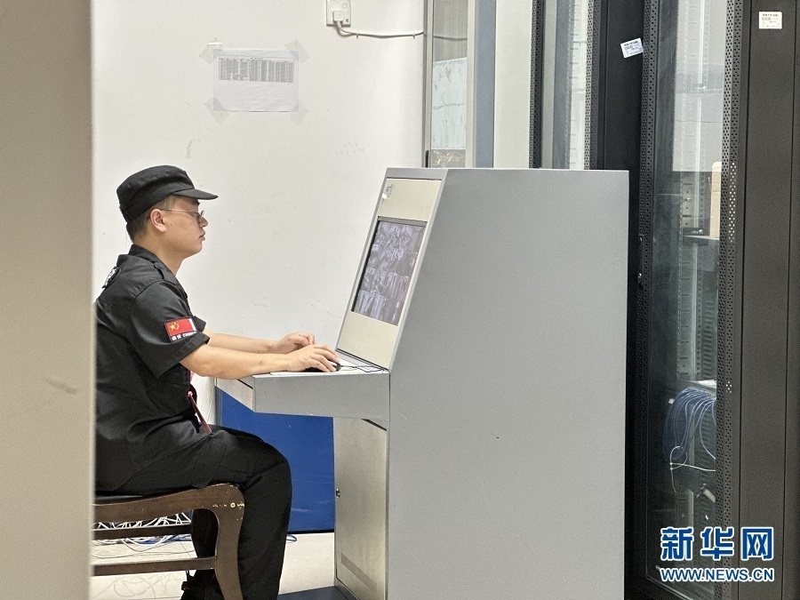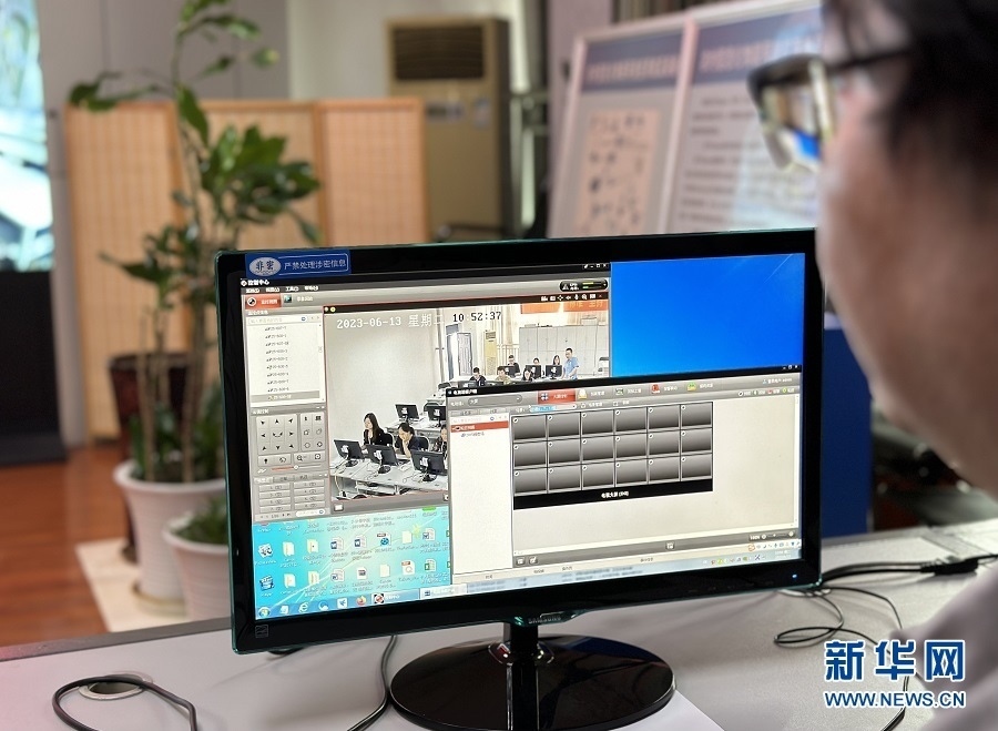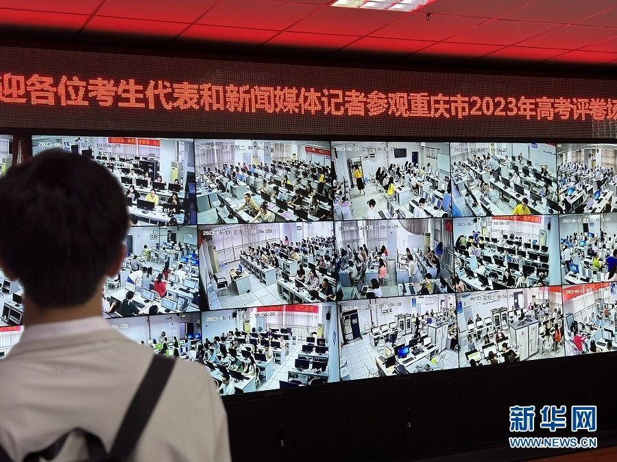 工作人員通過(guò)視頻查看閱卷現(xiàn)場(chǎng)情況。新華網(wǎng) 彭浩然 攝