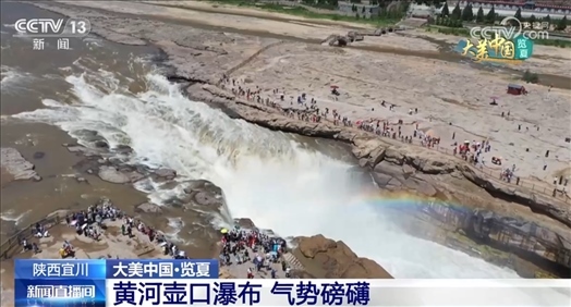 這是從陜西延安宜川縣拍攝到的黃河壺口瀑布。進(jìn)入夏季,壺口瀑布水位逐漸上升,水流開始增大,迎來(lái)夏季最佳觀賞期。從空中俯瞰,主瀑布波浪翻滾,氣勢(shì)磅礴,水霧在陽(yáng)光的照射下形成彩虹。