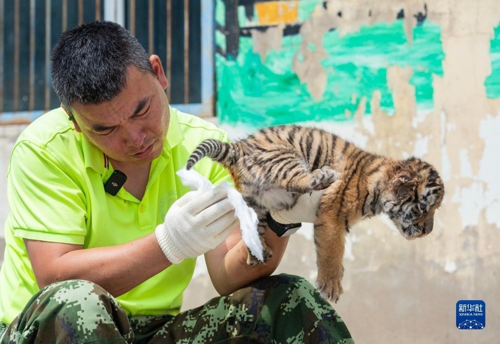 6月13日,在黑龍江東北虎林園,飼養(yǎng)員在清潔東北虎幼崽。