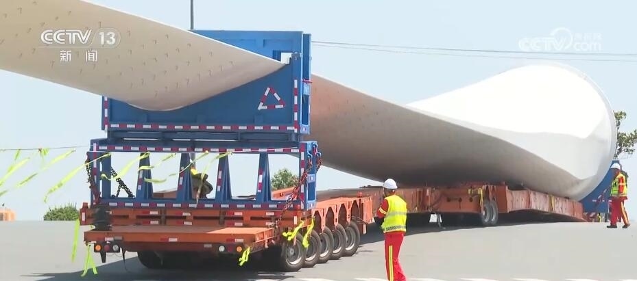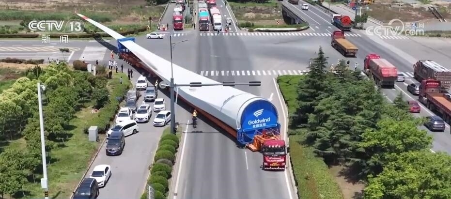 央視網消息:今天(6月14日)上午,100%我國自主知識產權的123米超長海上風電葉片在江蘇連云港啟動陸地轉運工作。上午9時,代表著我國風電裝備最新技術水準的大葉片,從廠區(qū)到港口碼頭,陸地運輸全程約30公里,耗時約3到4個小時,其中運輸大葉片的車輛還要拐過90度的直角彎。如此大體量的裝備運輸是一個復雜的過程,其中有哪些技術難點?來看記者今天上午從現場發(fā)回的報道。