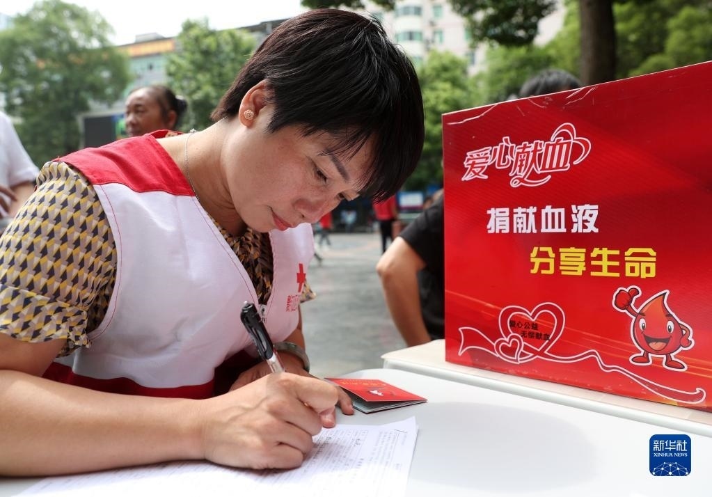 6月14日,志愿者在重慶市黔江區(qū)獻血愛心屋填寫無償獻血信息。