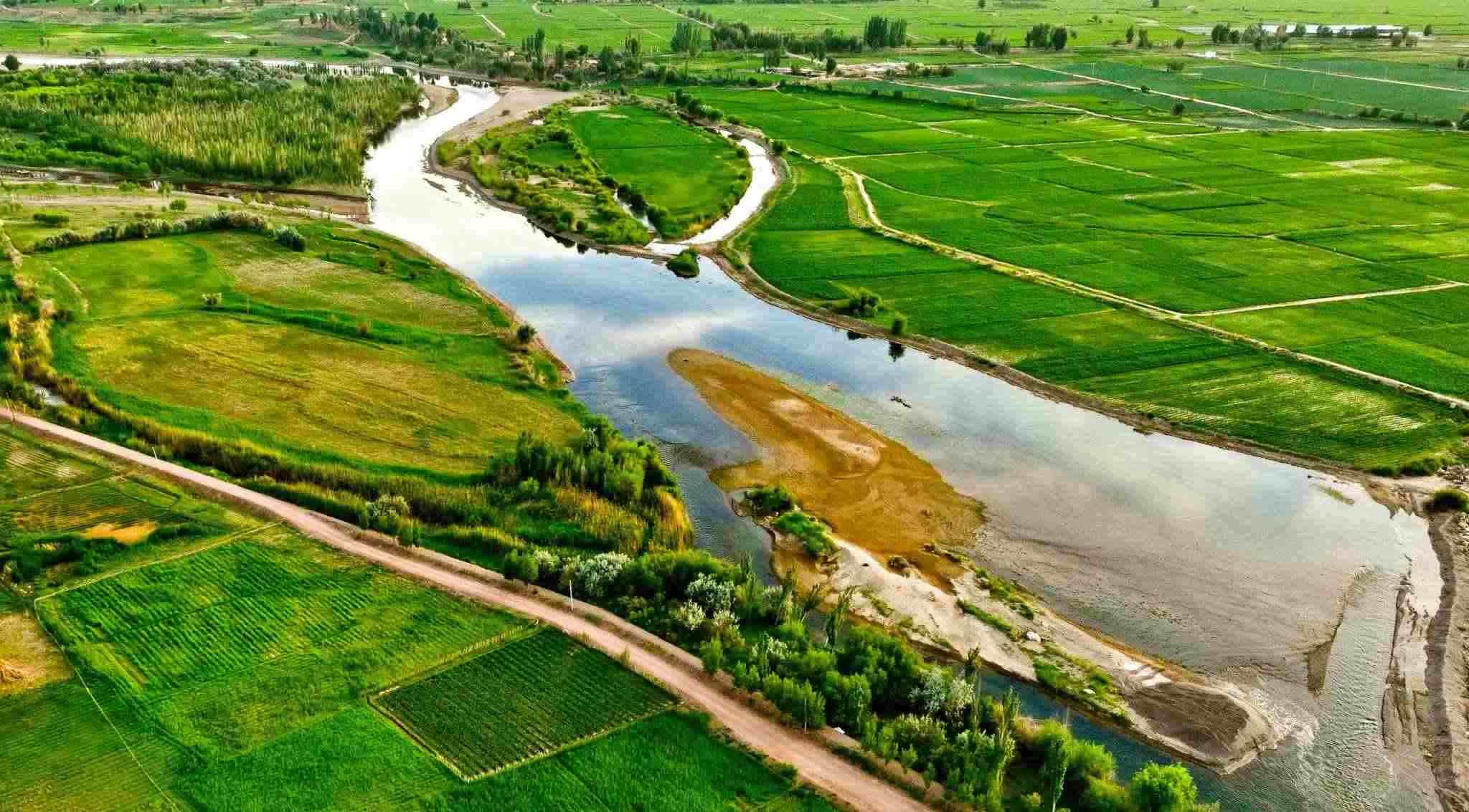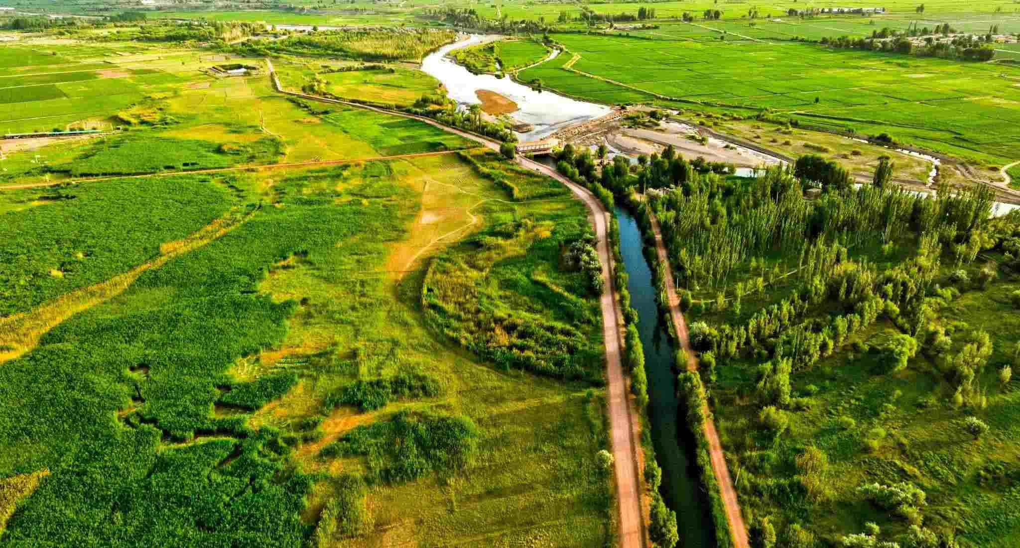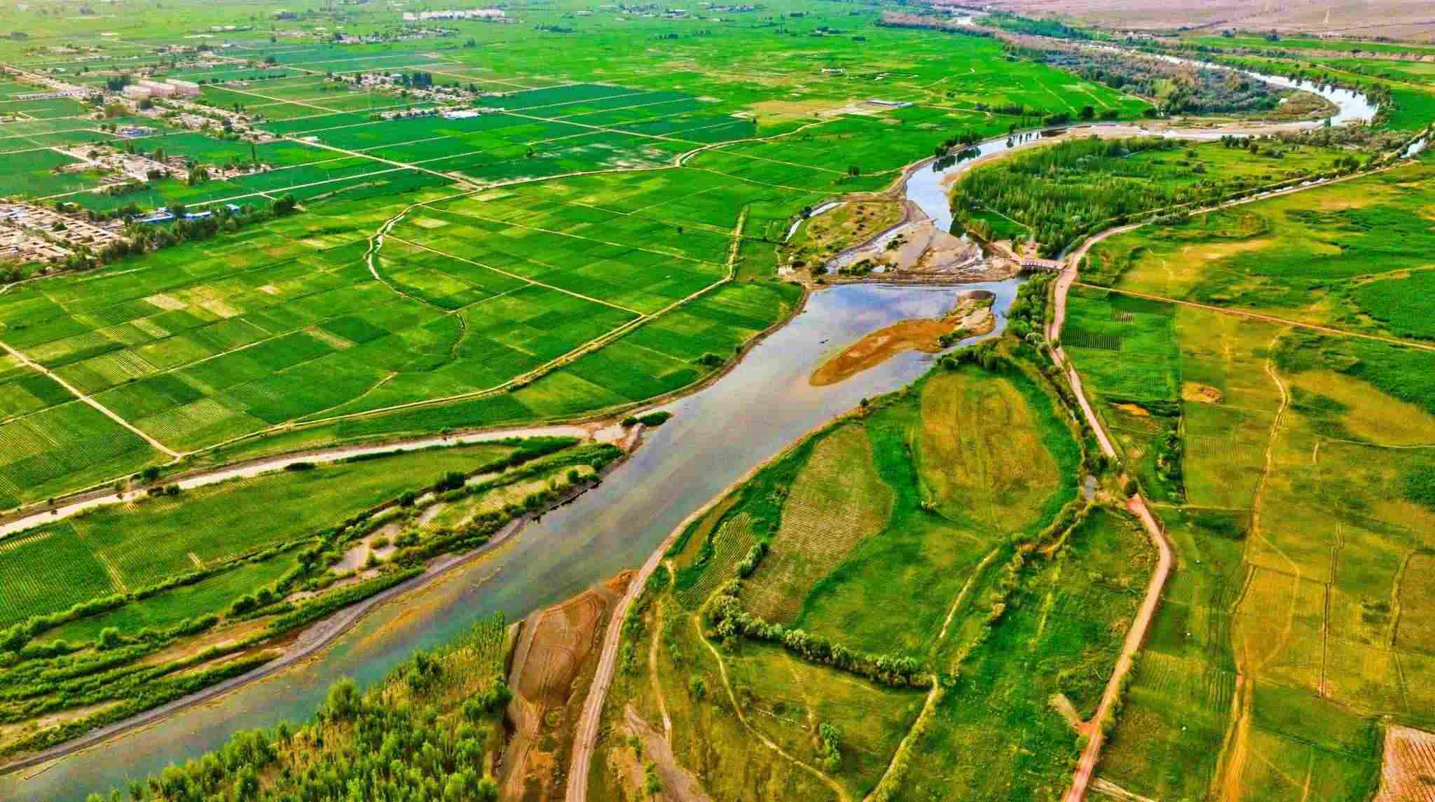 2023年6月15日,甘肅省張掖市,甘州區(qū)靖安鄉(xiāng)、臨澤縣板橋鎮(zhèn)境內(nèi)的黑河兩岸,寬闊的河床、彎曲的河流、農(nóng)作物以及樹木、蘆葦、濕地在夕陽(yáng)的映照下綠意盎然。視覺中國(guó)