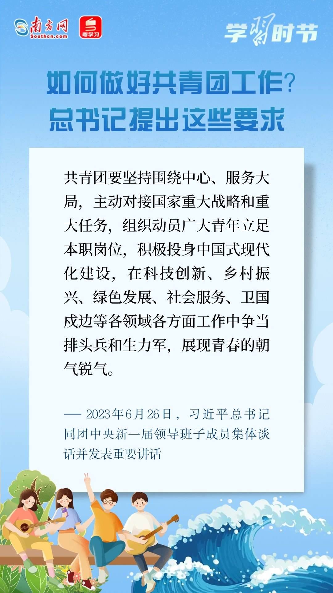 6月26日,習(xí)近平總書記同團(tuán)中央新一屆領(lǐng)導(dǎo)班子成員集體談話并發(fā)表重要講話??倳洀?qiáng)調(diào),黨和國(guó)家事業(yè)的希望寄托在青年身上。希望共青團(tuán)中央深入貫徹黨中央要求,切實(shí)肩負(fù)起新時(shí)代新征程黨賦予的使命任務(wù),傳承弘揚(yáng)優(yōu)良傳統(tǒng),堅(jiān)持改革創(chuàng)新,更好把青年一代團(tuán)結(jié)凝聚在黨的周圍,為推進(jìn)強(qiáng)國(guó)建設(shè)、民族復(fù)興偉業(yè)接續(xù)奮斗。