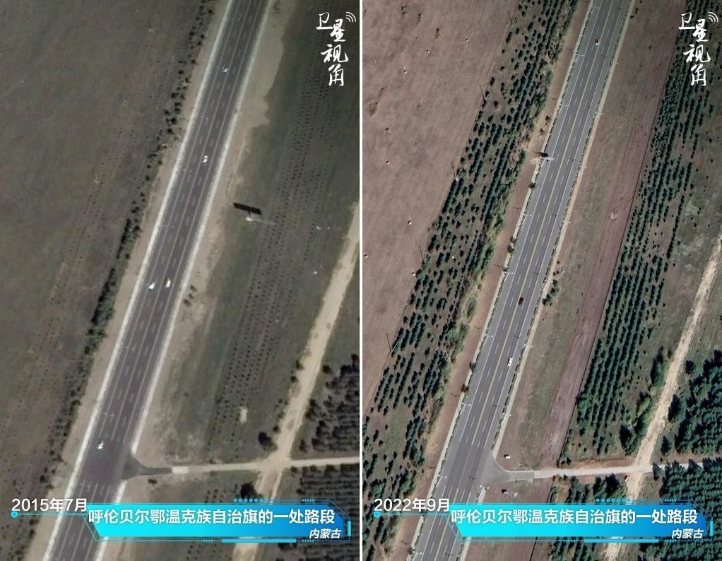 ↑2022年與2015年相比,內(nèi)蒙古呼倫貝爾鄂溫克族自治旗一處道路兩側(cè)樹木顯著增多。