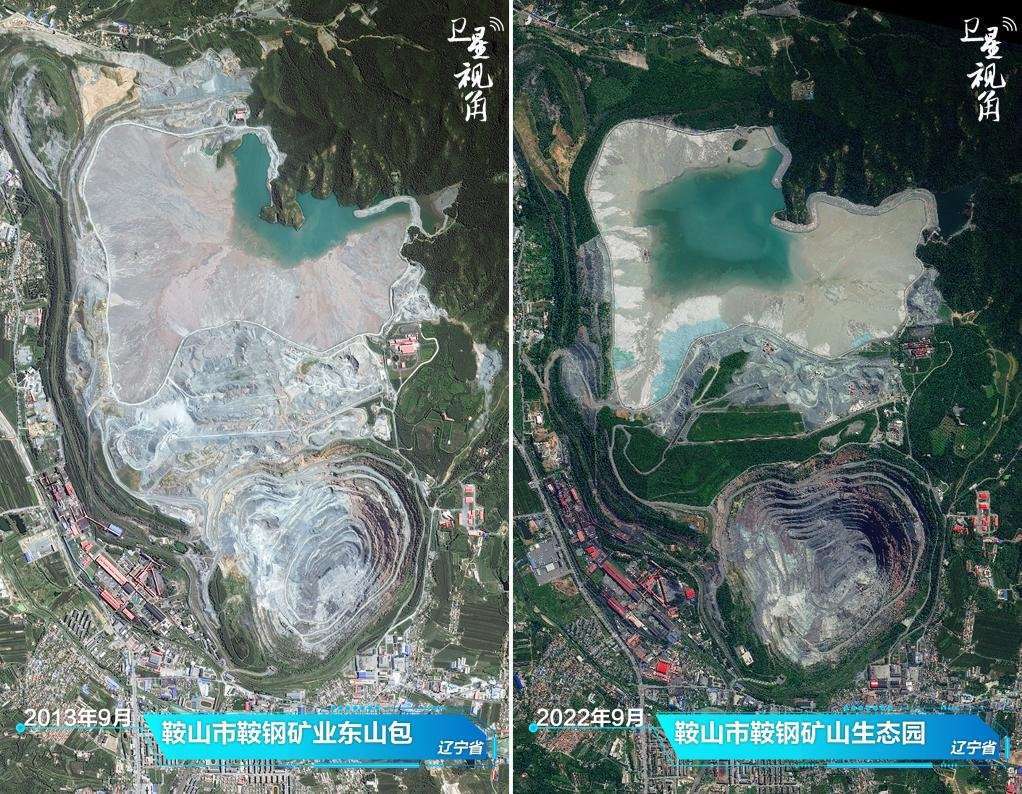 ↑2022年與2013年相比,曾經(jīng)塵土飛揚的鞍鋼礦山,如今蛻變?yōu)闈M眼綠意的生態(tài)園。