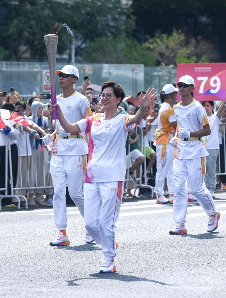 9月8日,火炬手羅雪娟在火炬?zhèn)鬟f中。當(dāng)日,杭州亞運(yùn)會(huì)火炬?zhèn)鬟f在杭州西湖涌金公園廣場(chǎng)啟動(dòng),共有106棒火炬手參與當(dāng)日傳遞。新華社記者孫非 攝