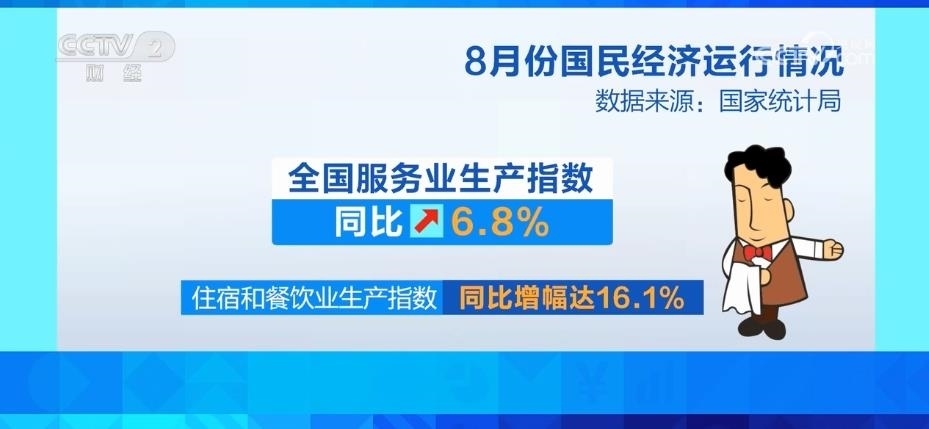 服務(wù)業(yè)較快增長(zhǎng),8月份,全國服務(wù)業(yè)生產(chǎn)指數(shù)同比增長(zhǎng)6.8%。其中,住宿和餐飲業(yè)依然保持較快增長(zhǎng),生產(chǎn)指數(shù)同比增幅達(dá)到16.1%。