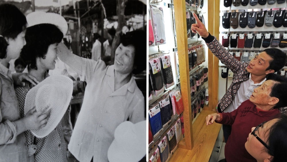 ↑拼版照片,左圖為:義烏小商品市場第一代經(jīng)營戶馮愛倩(右)在向顧客推銷遮陽帽(攝于上個世紀80年代);右圖為:2018年10月25日,78歲的馮愛倩(中)在傾聽她的孫子、義烏國際商貿(mào)城經(jīng)營戶楊帆(上)介紹他自產(chǎn)自銷的新款襪子。楊帆大學畢業(yè)后當上了父親創(chuàng)辦的襪業(yè)公司的總經(jīng)理。