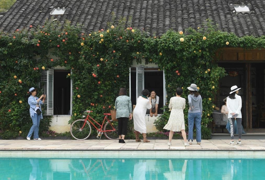 在浙江省湖州市埭溪鎮(zhèn)莫家柵村的玫瑰莊園,參觀者在玫瑰盛開的花墻前留影(2023年4月20日攝)。新華社記者 翁忻旸 攝