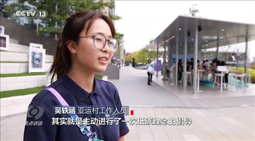 亞運村工作人員吳軼涵:“徽章交換中心建筑本身就是以低碳的材料制作而成的,同時也制作了以低碳材料而制作的徽章,這些徽章給運動員交換使用。所以每次在這里完成一次徽章交換其實就是主動進行了一次低碳理念的倡導?!?/p>