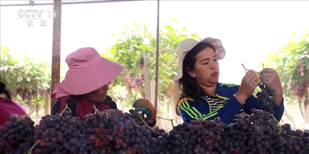 在新疆昆玉市千畝葡萄種植基地,工人們穿梭在葡萄園中,忙著采摘、分揀、稱重、打包、運(yùn)輸,一派繁忙景象。
