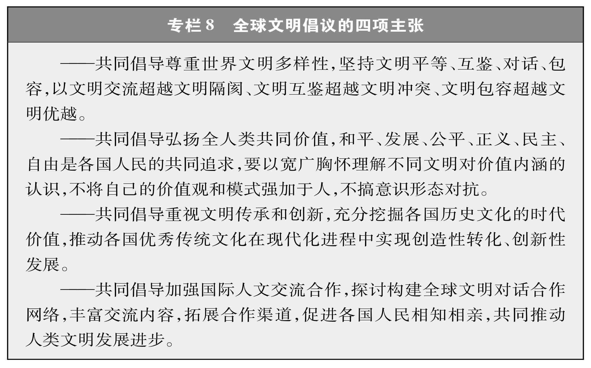 ——中國(guó)提出全球文明倡議,共同倡導(dǎo)尊重世界文明多樣性,共同倡導(dǎo)弘揚(yáng)全人類共同價(jià)值,共同倡導(dǎo)重視文明傳承和創(chuàng)新,共同倡導(dǎo)加強(qiáng)國(guó)際人文交流合作。全球文明倡議向全世界發(fā)出增進(jìn)文明交流對(duì)話、在包容互鑒中促進(jìn)人類文明進(jìn)步的真摯呼吁,為推動(dòng)構(gòu)建人類命運(yùn)共同體注入了精神動(dòng)力。