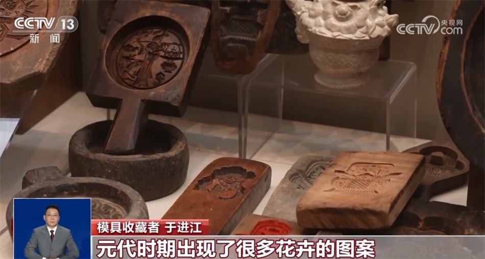 模具收藏者 于進(jìn)江:從宋代開始,我們會發(fā)現(xiàn)模具里面就出現(xiàn)了玉兔搗藥的造型;元代時期出現(xiàn)了很多花卉的圖案;到了明代時期,加入了很多題材,有期盼中秋節(jié)蟾宮折桂的,有祝壽團(tuán)圓的;清代時期,(出現(xiàn)了)很多故事圖案月餅。