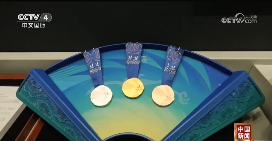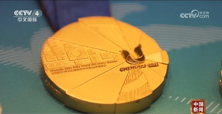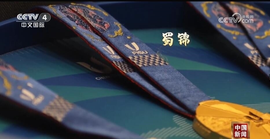 總臺記者 王豐:走進成都大運會博物館,最大的感受就是成都的元素無處不在。比如,我們剛一進來,右手邊是成都大運會的吉祥物蓉寶??赐耆貙殠鷣砜纯慈毓?,什么是蓉光呢?獎牌代表了成都大運會的榮譽,“蓉”是取自成都的簡稱,包含了光榮和融合的含義,整個獎牌的設計是呈現(xiàn)了不規(guī)則的圓形。另外,獎牌的元素包含成都市的標志——太陽神鳥。此外,在獎牌的綬帶設計上首次采用了蜀錦的制作工藝,實際上也是非物質(zhì)文化遺產(chǎn)活化利用的非常好的案例。