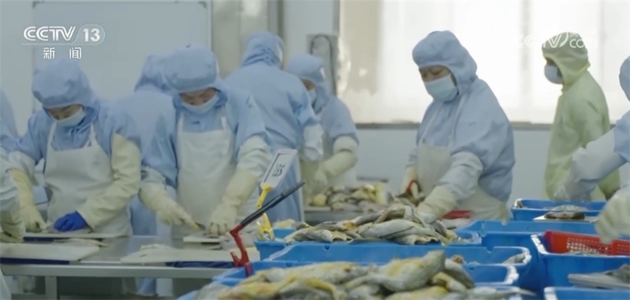 總臺(tái)央視記者 馬寧:我現(xiàn)在來(lái)到了寧德市當(dāng)?shù)匾患冶容^大的黃魚(yú)生產(chǎn)企業(yè),大家可以看到我身后就是工人們正在把已經(jīng)腌制好的黃魚(yú)經(jīng)過(guò)分撿、稱重、打包、送進(jìn)冷庫(kù),這些經(jīng)過(guò)處理的大黃魚(yú)就可以通過(guò)冷鏈物流送到千家萬(wàn)戶的餐桌上。