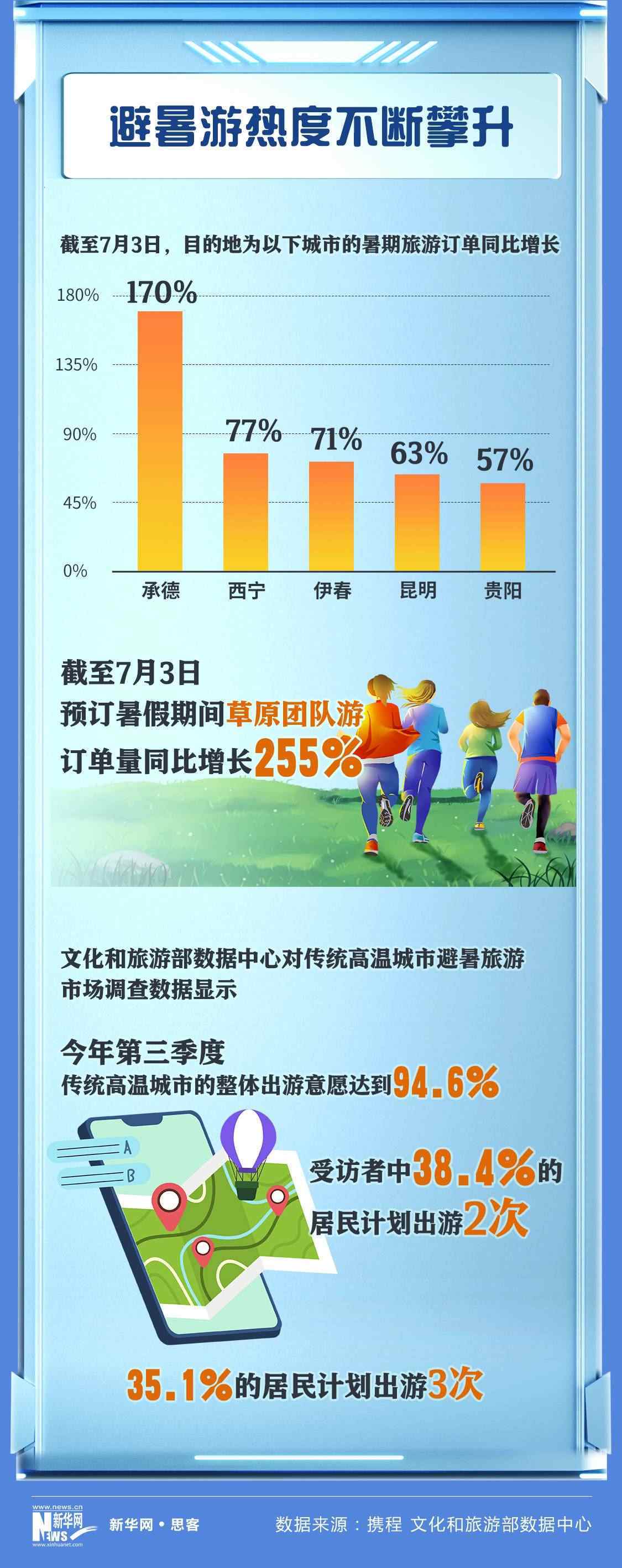 文化和旅游部數(shù)據(jù)中心不久前對傳統(tǒng)高溫城市避暑旅游市場調(diào)查數(shù)據(jù)顯示,今年第三季度傳統(tǒng)高溫城市的整體出游意愿達(dá)到94.6%,受訪者中38.4%的居民計劃出游2次,35.1%的居民計劃出游3次。