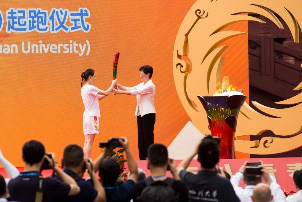 7月2日,第一棒火炬手吳敏霞(左)接過點燃的火炬。當(dāng)日,成都第31屆世界大學(xué)生夏季運動會火炬?zhèn)鬟f成都站起跑儀式在四川大學(xué)校園內(nèi)舉行。新華社發(fā)(曹鵬攝)
