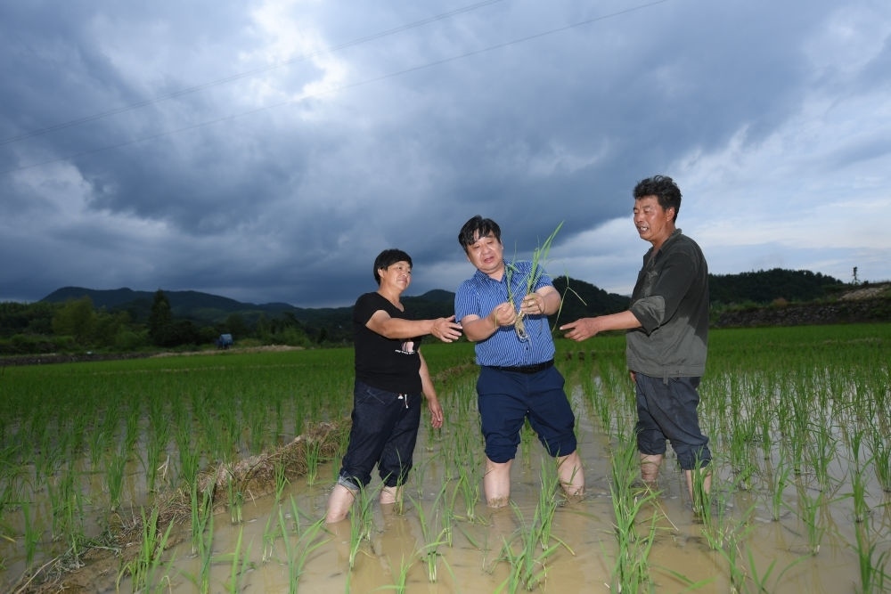 在浙江省仙居縣廣度鄉(xiāng)西角村,浙江大學(xué)環(huán)境與資源學(xué)院教授吳良?xì)g(中)在省級(jí)科研試驗(yàn)田里指導(dǎo)農(nóng)戶進(jìn)行水稻種植(7月4日攝)。新華社記者 翁忻旸 攝