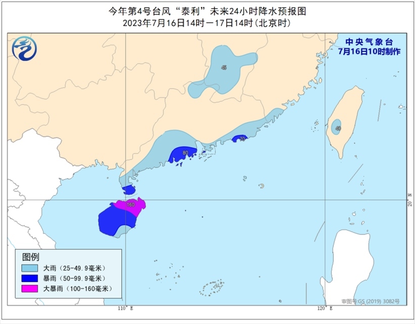 央視網(wǎng)消息:據(jù)中央氣象臺網(wǎng)站消息,今年第4號臺風(fēng)“泰利”(強(qiáng)熱帶風(fēng)暴級)的中心今天(16日)上午9點(diǎn)鐘位于我國廣東省湛江市東偏南方向約660公里的南海東北部海面上,就是北緯18.9度、東經(jīng)116.2度,中心附近最大風(fēng)力有10級(25米/秒),中心最低氣壓為985百帕,七級風(fēng)圈半徑280公里。