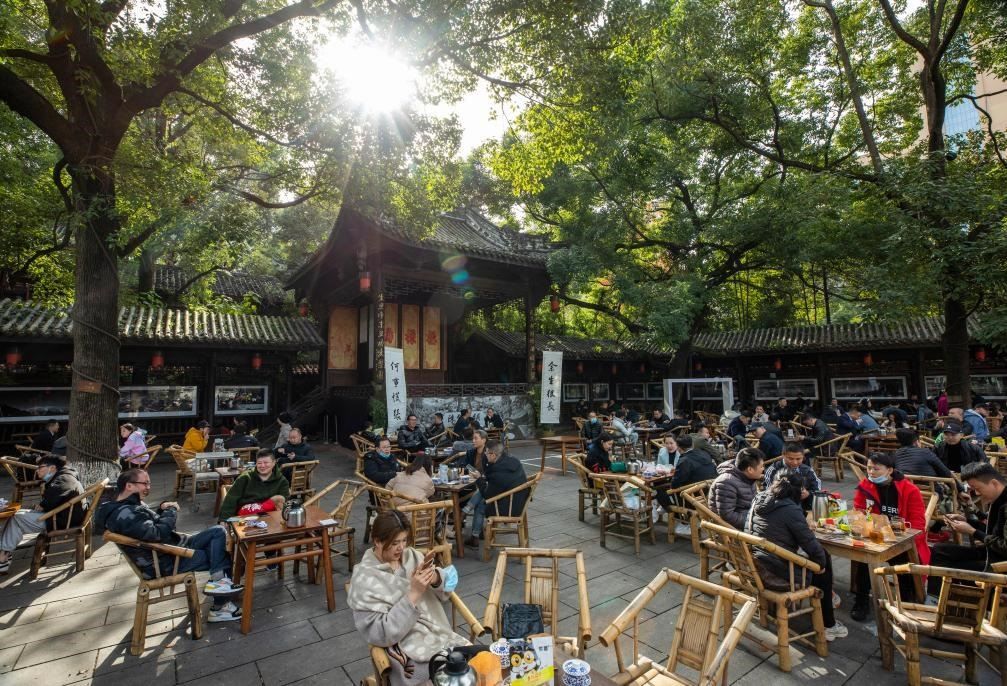 位于成都鐵像寺水街的陳錦茶鋪前坐滿了曬太陽喝茶休閑的人