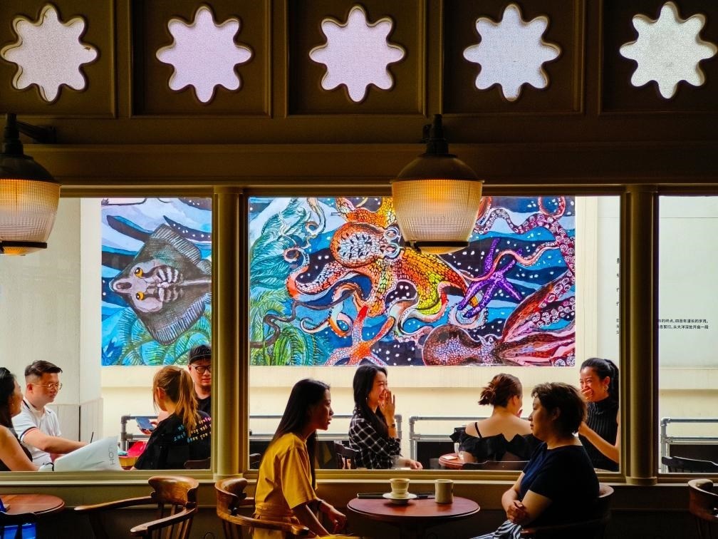 人們在成都大源中央公園的Regular·源野生活空間內的咖啡館里休閑