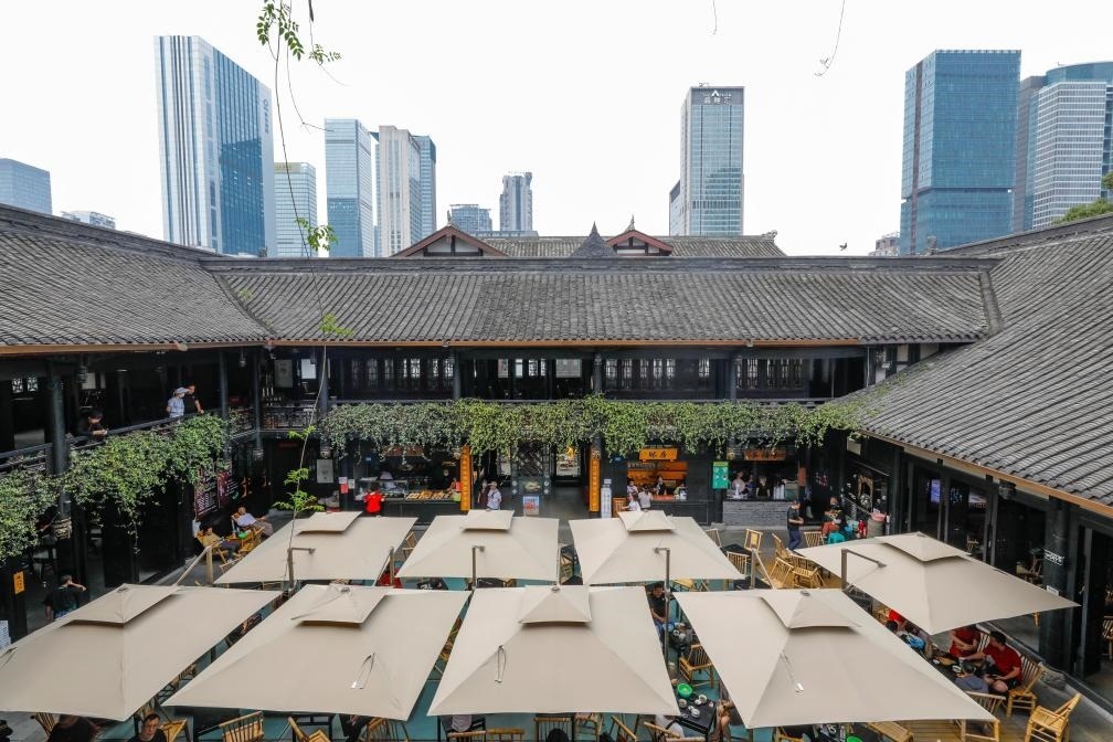 人們在成都太古里大慈寺內的茶社喝茶、休閑,不遠處高樓林立