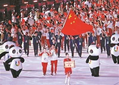 中國(guó)大學(xué)生體育代表團(tuán)運(yùn)動(dòng)員及官員,在兩位旗手郭涵煜和胡朕卓的引領(lǐng)下迎面走來,全場(chǎng)掌聲雷動(dòng)。