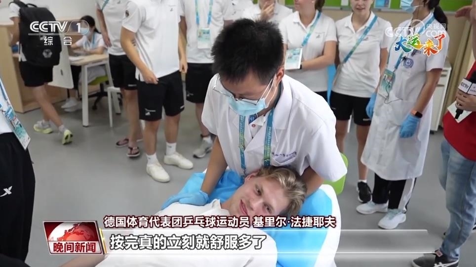 德國體育代表團(tuán)乒乓球運(yùn)動員 尼爾斯·霍邁爾:不敢想象在大運(yùn)村還有這么好的醫(yī)療服務(wù),之前完全沒想到。在德國也有一些診所提供類似服務(wù),但能在這里感受一手的中醫(yī)康復(fù)服務(wù),真的太酷了。