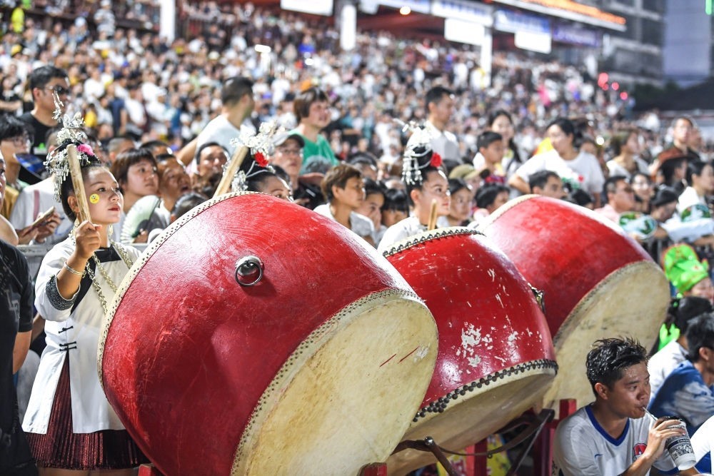7月15日,拉拉隊(duì)在貴州“村超”足球賽場(chǎng)邊擊鼓助威。新華社記者 楊文斌 攝