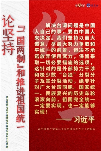 解決臺(tái)灣問(wèn)題、實(shí)現(xiàn)祖國(guó)完全統(tǒng)一,是中國(guó)共產(chǎn)黨矢志不渝的歷史任務(wù),是全體中華兒女的共同愿望,是實(shí)現(xiàn)中華民族偉大復(fù)興的必然要求。必須堅(jiān)持貫徹新時(shí)代黨解決臺(tái)灣問(wèn)題的總體方略,牢牢把握兩岸關(guān)系主導(dǎo)權(quán)和主動(dòng)權(quán),堅(jiān)定不移推進(jìn)祖國(guó)統(tǒng)一大業(yè)。