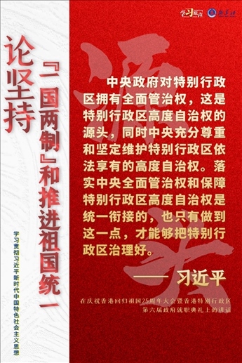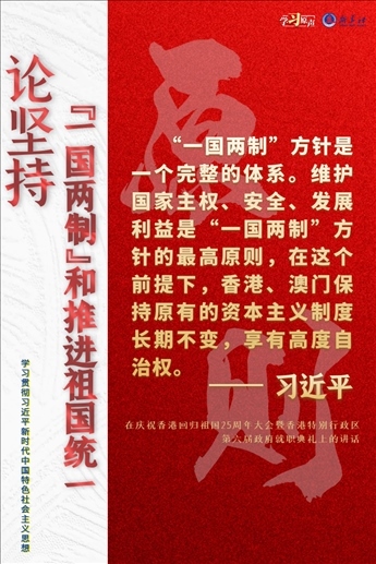 “一國(guó)兩制”是黨領(lǐng)導(dǎo)人民實(shí)現(xiàn)祖國(guó)和平統(tǒng)一的一項(xiàng)重要制度,是國(guó)家的一項(xiàng)基本國(guó)策。中國(guó)特色社會(huì)主義進(jìn)入了新時(shí)代,意味著“一國(guó)兩制”事業(yè)也進(jìn)入了新時(shí)代。不斷推進(jìn)“一國(guó)兩制”在香港、澳門(mén)的成功實(shí)踐,是中華民族偉大復(fù)興歷史進(jìn)程的重要組成部分。