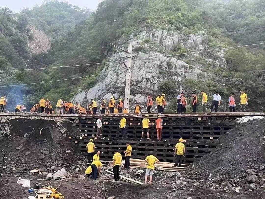 救援物資專列一邊清理線路