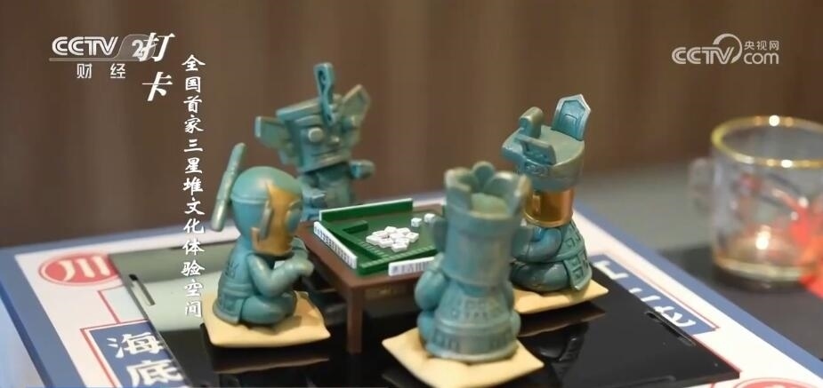 成都臺記者 劉然然:大家看我手中拿著的銅人,是按照三星堆博物館中的青銅人首鳥身像藏品復(fù)刻的。無論是造型還是材質(zhì),都盡量做到和館藏一致。這里是三星堆博物館官方授權(quán)的全國首家體驗空間。