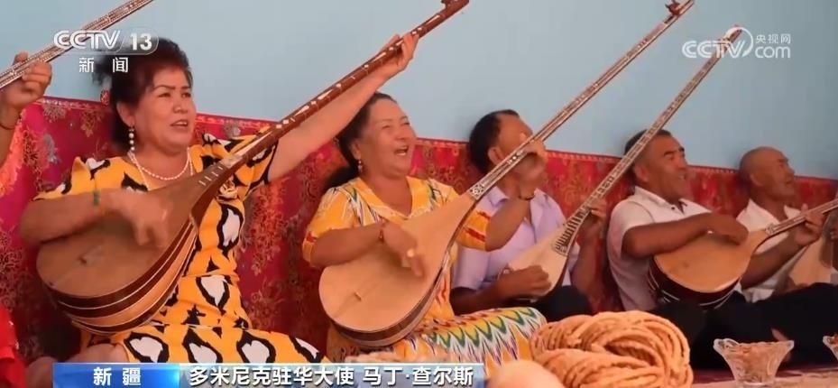 駐華使節(jié)們走進(jìn)喀什古城的街市巷陌,感受當(dāng)?shù)鬲毺氐拿褡逦幕辉诳俗螤柷Х鸲?,領(lǐng)略跨越千年的石窟藝術(shù);來到新疆民間手工樂器制作第一村庫車市新和縣加依村,同當(dāng)?shù)匕傩找黄疠d歌載舞;觀看非遺項目十二木卡姆等一系列活動,讓使節(jié)們感嘆,新疆少數(shù)民族傳統(tǒng)文化和生活習(xí)俗得到了充分保護(hù)。