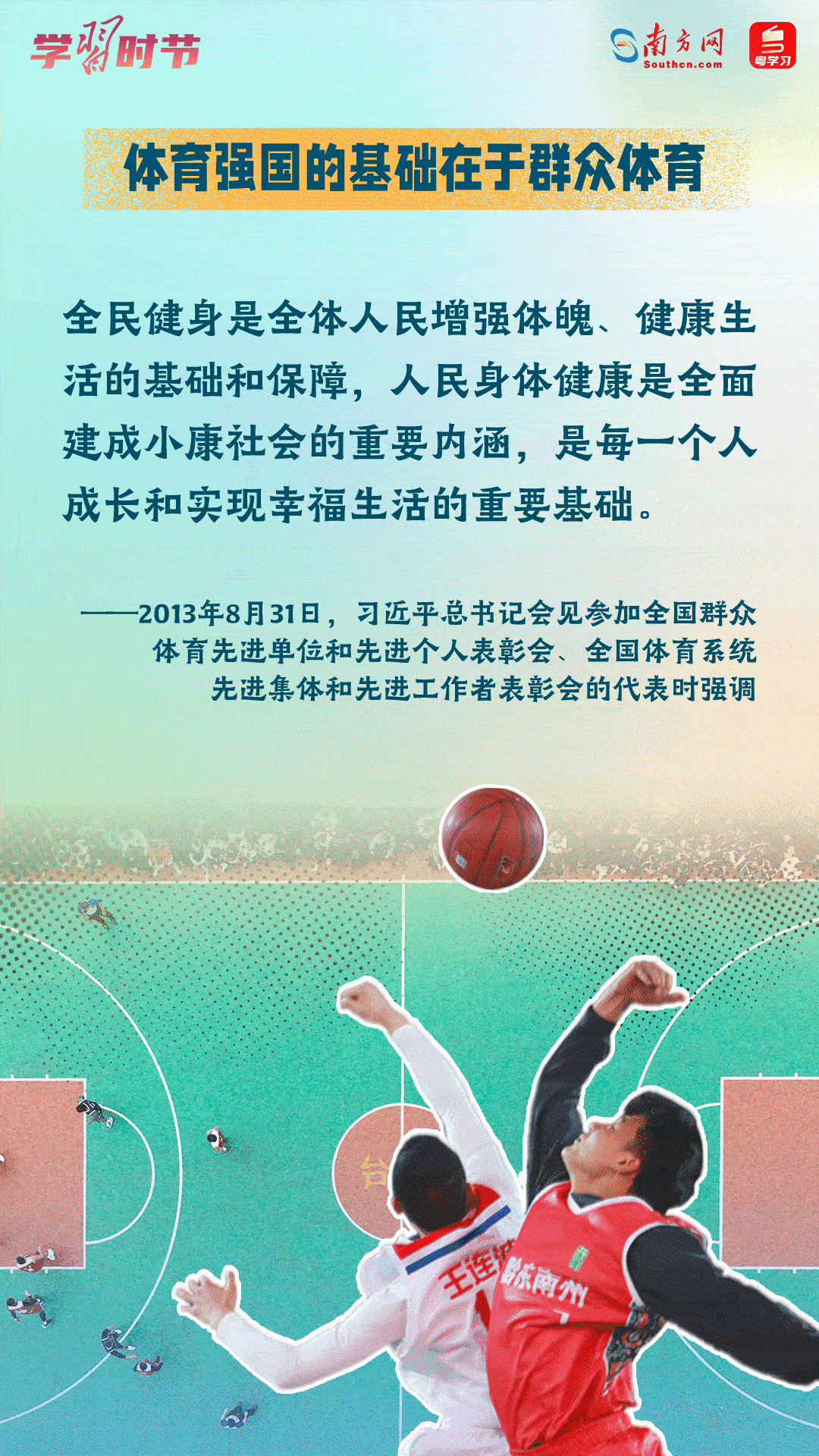 今年8月8日是我國(guó)第15個(gè)“全民健身日”,讓我們學(xué)習(xí)領(lǐng)悟習(xí)近平總書記關(guān)于推進(jìn)全民健身的重要論述,一起加入全民健身的隊(duì)伍中,通過健身收獲健康、收獲快樂!