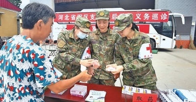 8月9日,河北省軍區(qū)石家莊第三干休所醫(yī)生為當?shù)厥転娜罕娏x診并發(fā)放藥品。劉松峰攝(人民視覺)