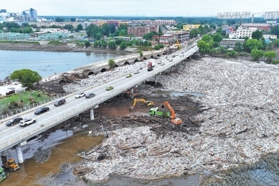8月7日,北京市房山區(qū)琉璃河橋,大型機械在清理水面漂浮物,疏通河道。本報記者 雷 聲攝