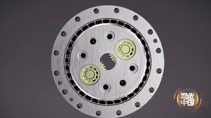 打開(kāi)RV減速機(jī),里面就像一個(gè)太陽(yáng)系,既有太陽(yáng)輪,也有行星輪。這就是RV減速機(jī)的擺線行星輪,它們就像圍繞太陽(yáng)的行星,既有自轉(zhuǎn)也有公轉(zhuǎn),自轉(zhuǎn)一圈的同時(shí)公轉(zhuǎn)40圈,通過(guò)多組行星運(yùn)動(dòng)實(shí)現(xiàn)精密傳動(dòng),把電機(jī)的高速轉(zhuǎn)動(dòng)降下來(lái),同時(shí)增大轉(zhuǎn)矩,驅(qū)動(dòng)機(jī)器人手臂旋轉(zhuǎn)。